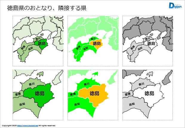 フリー、無料で使える徳島県のおとなり、隣接する県のイラスト画像です。パワーポイントPPTX形式、PNG透明ファイル形式を用意しています。