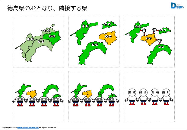 徳島県のおとなり、隣接する県を表すイラスト画像です。また擬人化風にもしてします。日本、都道府県、地理に関する素材などにご活用ください。