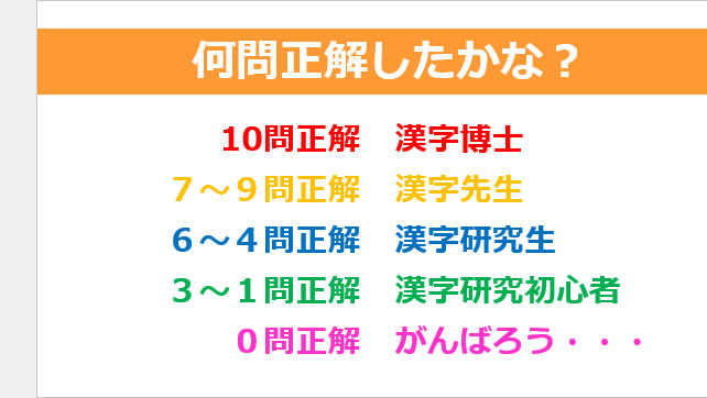 漢字クイズ~正しい四字熟語はどれ?~のタイトル、出題と回答10問、最終画面の22スライド。