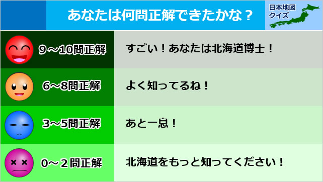 日本地図クイズ~北海道編~のタイトル、出題と回答10問、最終画面の23スライド。