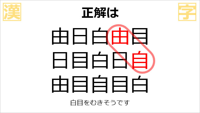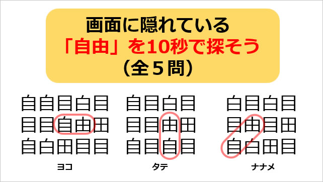 自由という文字を探す漢字クイズ番組です。クイズと回答を交互に表示しています。スライドショーを利用した番組コンテンツなどにご活用ください。そのままでも、問題を改変して利用していただいて構いません。
