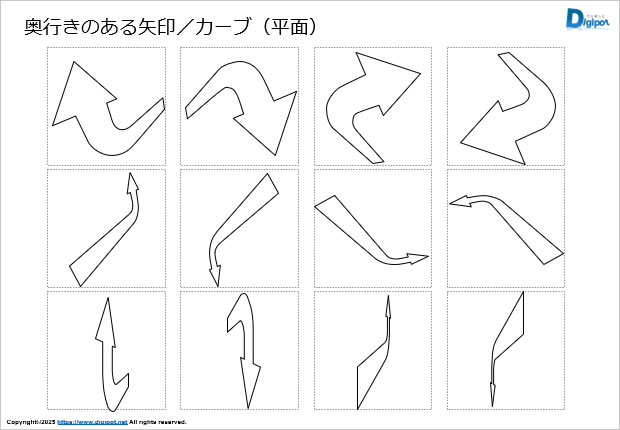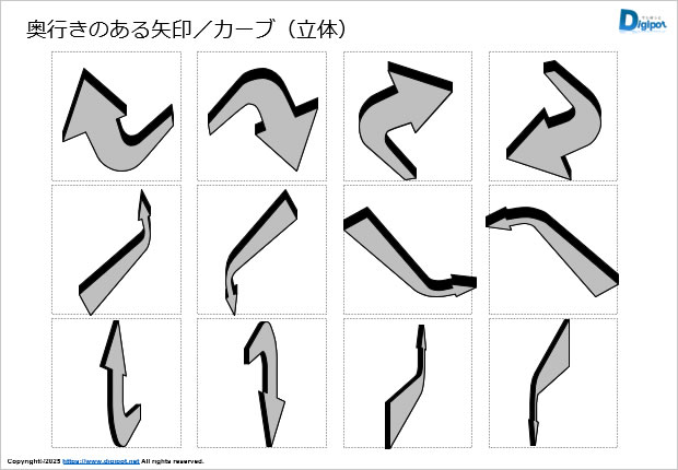 奥行きのある矢印/カーブ(パワーポイント/PNG形式画像/エクセル/ワード)
