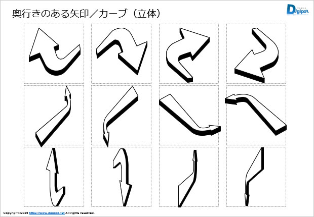 奥行きのあるカーブ矢印、平面、立体、上下斜めなど36種類