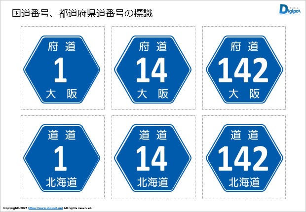 国道番号、都道府県道番号の標識、1桁用、2桁用、3桁用など