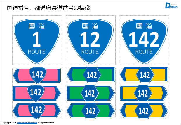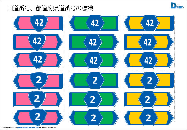 フリー、無料で使える国道番号、都道府県道番号の標識です。パワーポイントPPTX形式で制作しています。