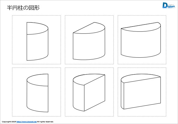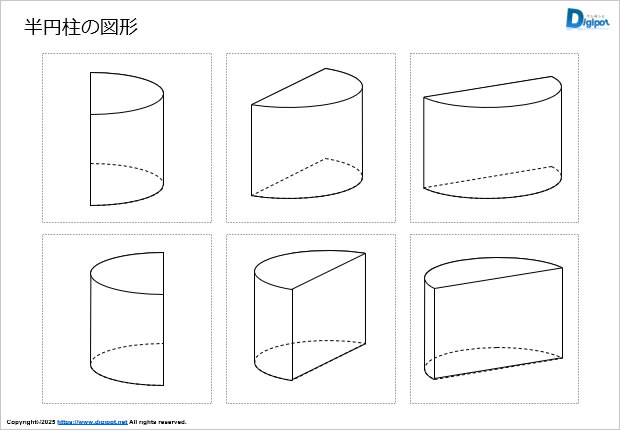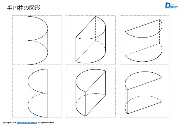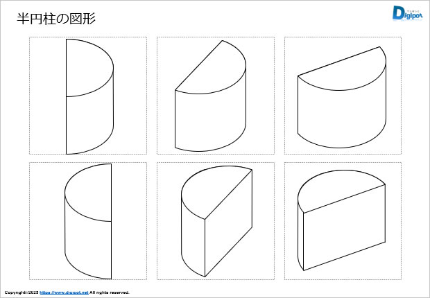 半円柱の斜め上から見下ろした図形です。学習素材等にご活用ください。
