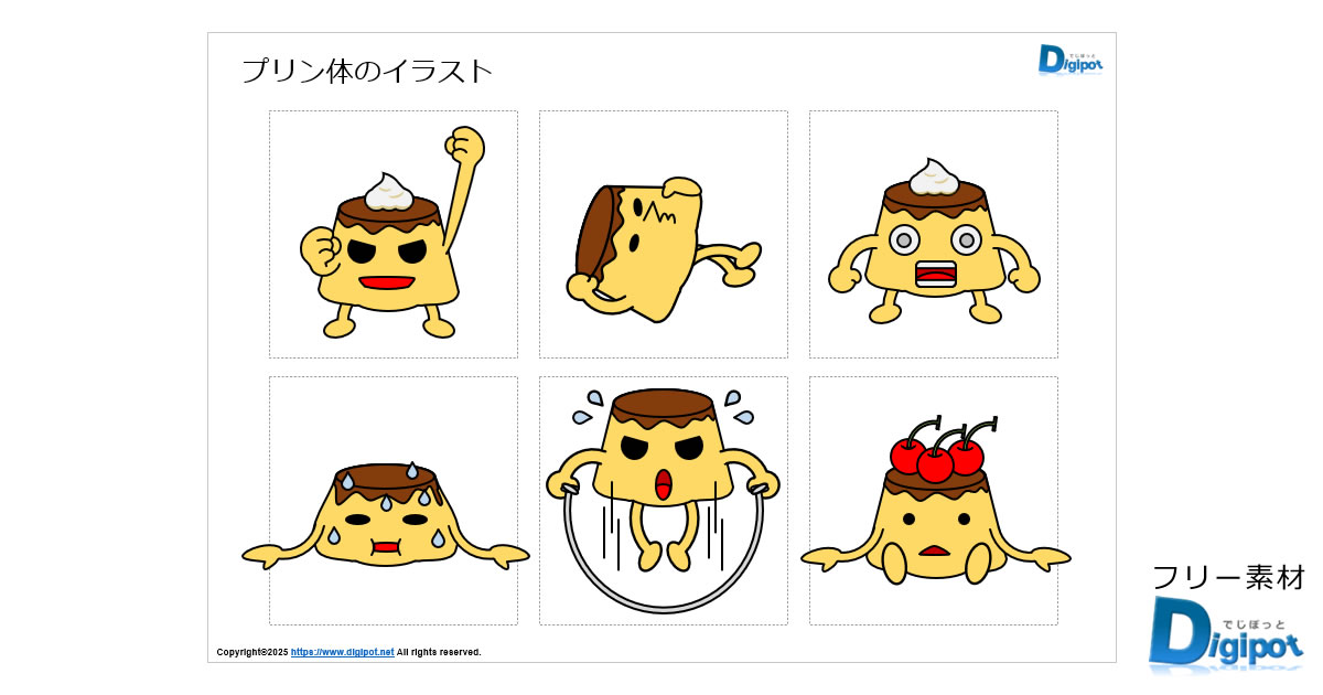 フリー、無料で使えるプリン体のイラスト画像です。パワーポイントPPTX形式、PNG透明ファイル形式、エクセルXLSX形式、ワードDOCX形式ファイルを用意しています。