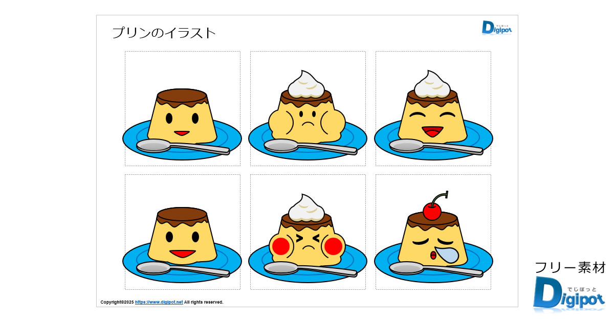 プリンのイラスト、お皿に乗ったプリン、頭にクリーム、頭にサクランボ、フチ有りフチ無しなど12種類