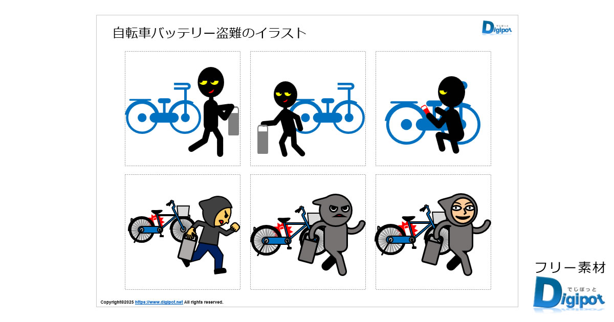 自転車バッテリー盗難のイラスト、自転車からバッテリーを持ち去る、怪しい人物など6種類