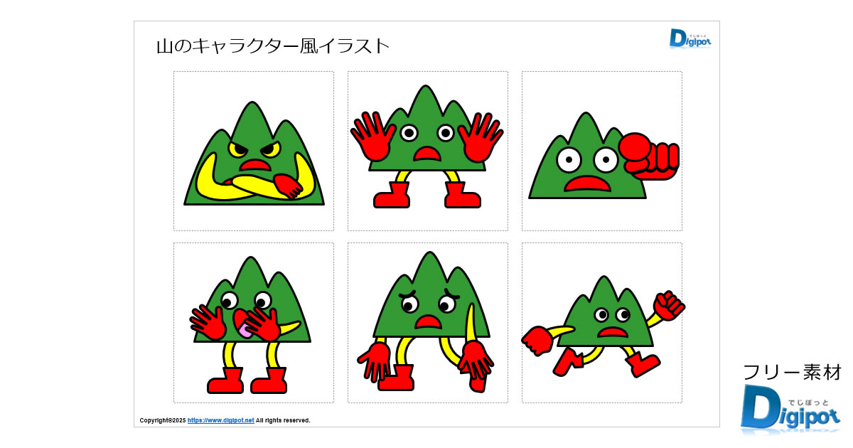フリー、無料で使える山のキャラクター風イラスト画像です。パワーポイントPPTX形式、PNG透明ファイル形式、エクセルXLSX形式、ワードDOCX形式ファイルを用意しています。