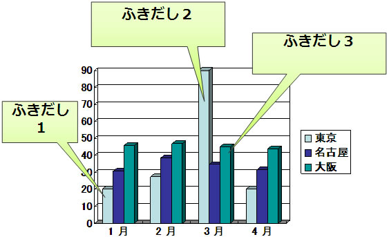 上記の例では、描画した吹き出し内に文字は入力できませんが、(吹き出しの上に重なるように文字を入力してください。)下記のように四角を先に描いた後に三角の部分を描いて、同色じ色にすれば四角の中にも文字をかけるようになります。