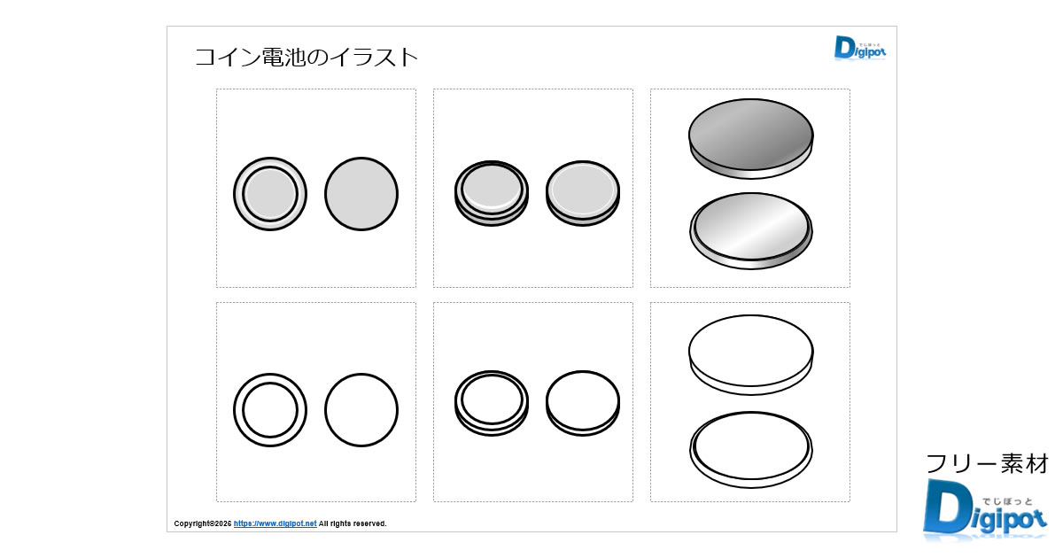 フリー、無料で使えるコイン電池のイラスト画像です。パワーポイントPPTX形式、PNG透明ファイル形式、エクセルXLSX形式、ワードDOCX形式ファイルを用意しています。
