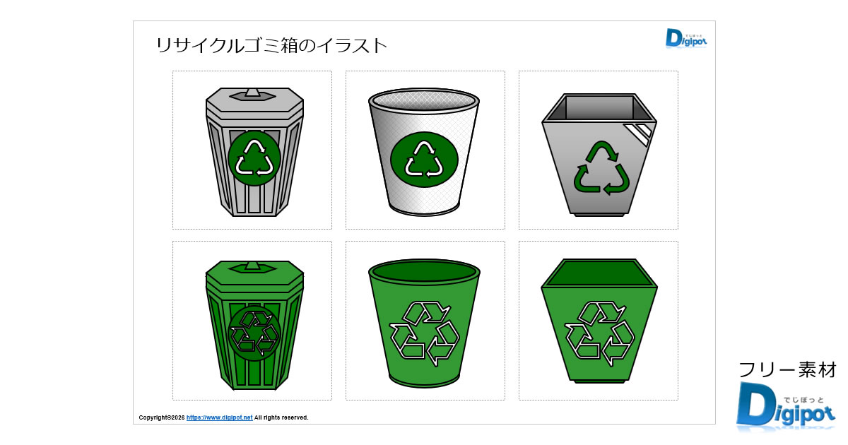 フリー、無料で使えるリサイクルゴミ箱のイラスト画像です。パワーポイントPPTX形式、PNG透明ファイル形式、エクセルXLSX形式、ワードDOCX形式ファイルを用意しています。