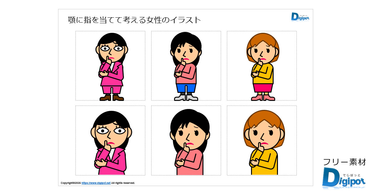 フリー、無料で使える顎に指を当てて考える女性のイラスト画像です。パワーポイントPPTX形式、PNG透明ファイル形式、エクセルXLSX形式、ワードDOCX形式ファイルを用意しています。