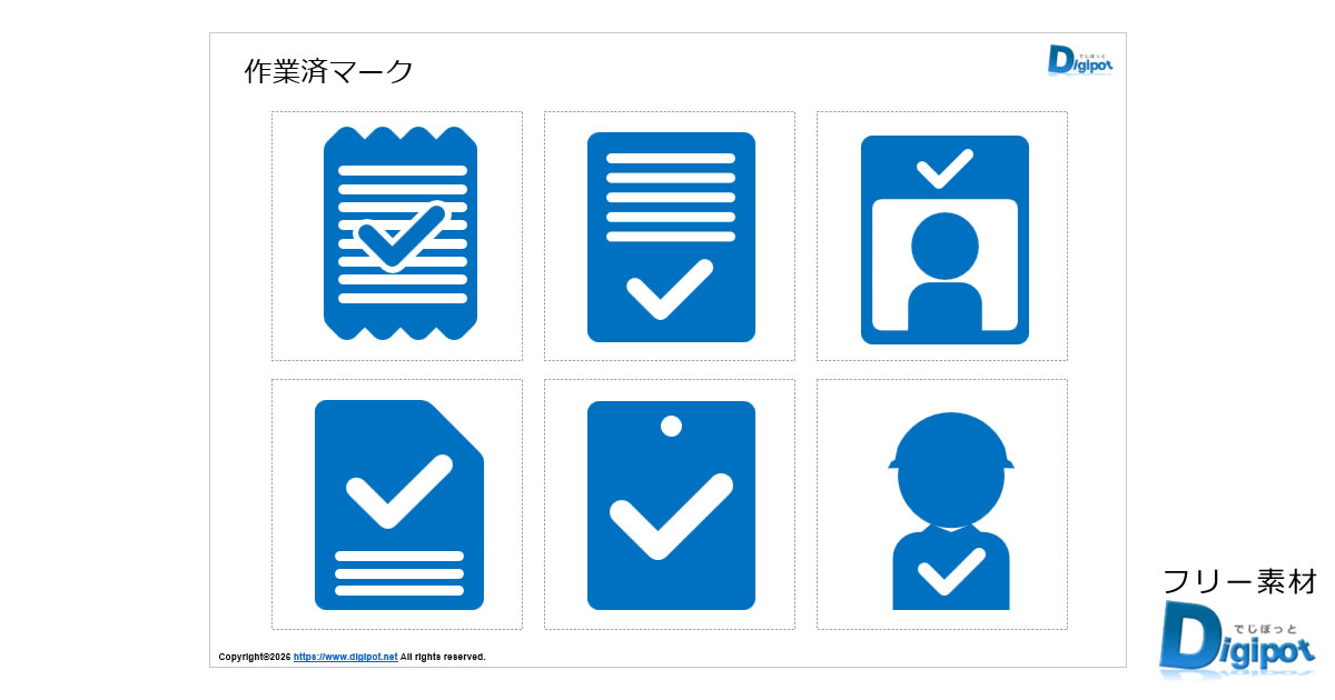フリー、無料で使える作業済マーク画像です。パワーポイントPPTX形式、PNG透明ファイル形式、エクセルXLSX形式、ワードDOCX形式ファイルを用意しています。