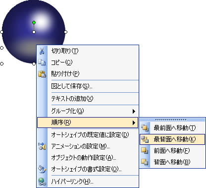 次に縦の高さを半分にして、図形の上で右クリックします。メニューから「順序」→「最背面へ移動を選択します。」