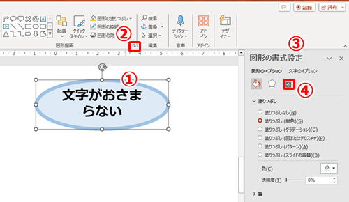 パワーポイントの図形の中に文字が収まらない場合の対処法
