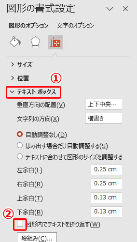 (1)テキストボックスの項目から、(2)「図形内でテキストを折り返す」のチェックを外します。