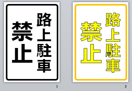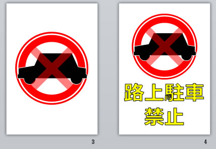 「路上駐車禁止」の文字のみ、「路上駐車禁止」とアイコン表示などA4縦/横
