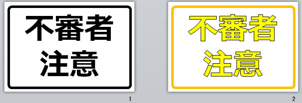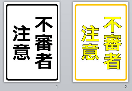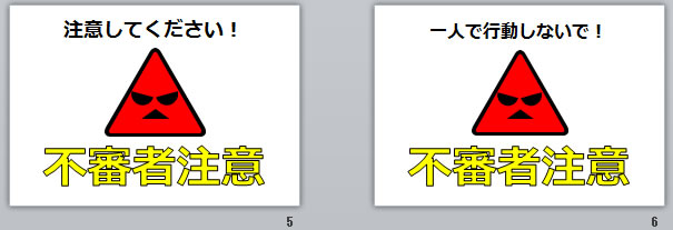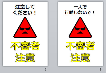 「不審者注意」の文字のみ、「不審者注意」とアイコン表示などA4縦/横