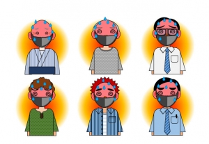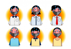 フリー、無料で使えるマスクで熱中症気味の人物のイラスト画像です。パワーポイントPPTX形式、PNG形式画像で作成しています。12パターンあります。